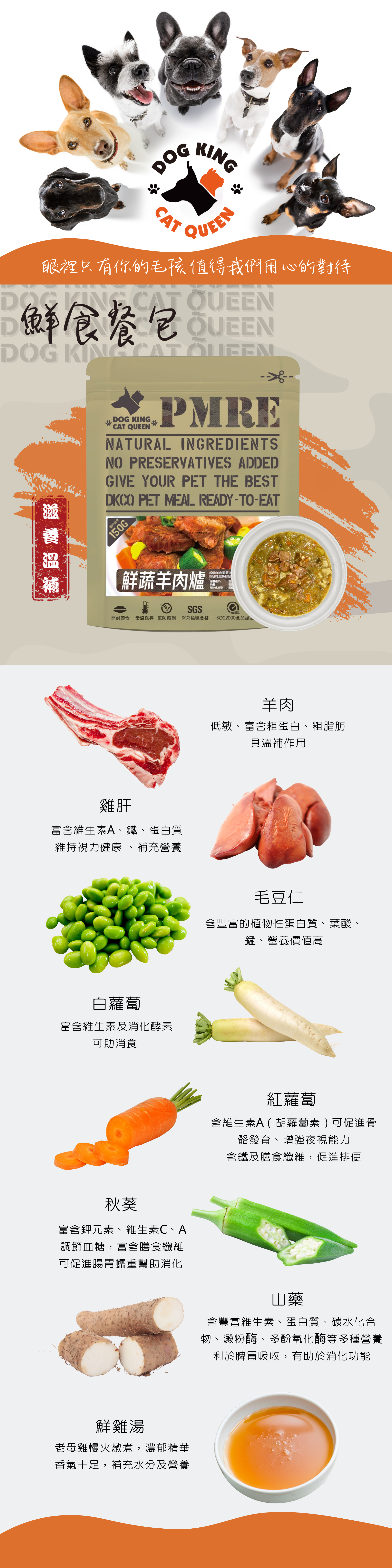 商品特色:溫補系台灣經典湯品——羊肉爐。以溫和不燥的羊肉為基底,搭配胡蘿蔔、白蘿蔔、秋葵與毛豆仁等營養蔬食,燉煮出香氣四溢、滋味鮮甜的毛孩主食。四季皆宜,吃得健康、也吃得開心。