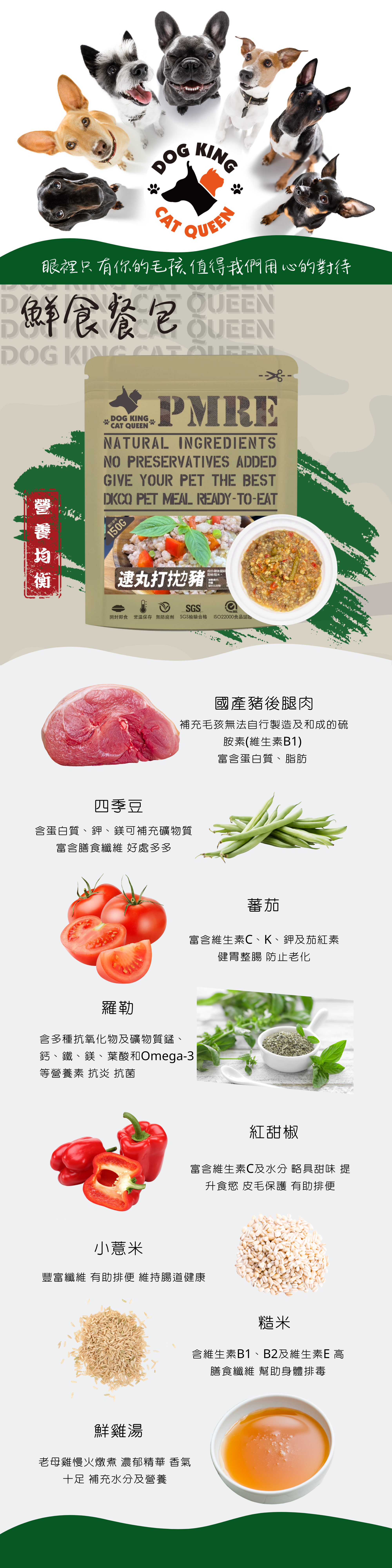 商品特色:向經典台式打拋風味致敬!嚴選國產黑後腿豬肉,搭配牛番茄、紅甜椒、四季豆與羅勒粉,呈現地道風味又不刺激,適合毛孩每日享用。糙米與薏仁讓餐包口感更豐富,幫助提升飽足感與消化吸收,是讓毛孩一吃上癮的「狗界台菜」!