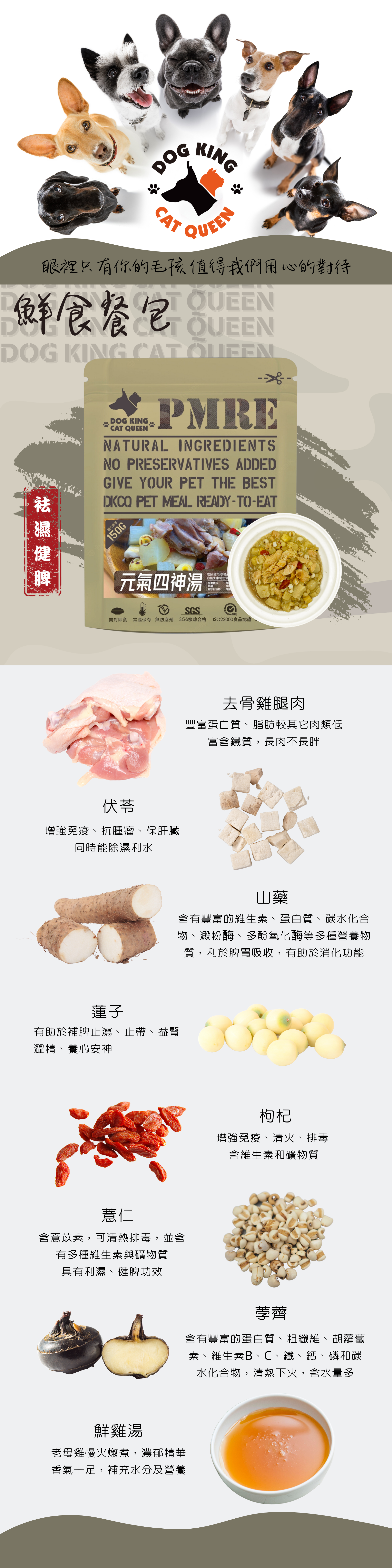 源自台灣古法養生湯品,元氣四神湯專為狗狗設計,以去骨雞腿肉為主角,搭配茯苓、蓮子、山藥、枸杞與大薏仁等珍貴食材,慢火燉煮、自然入味。香氣溫潤、口感軟嫩,幫助毛孩健脾開胃、消化順暢,是日常保養的好選擇。